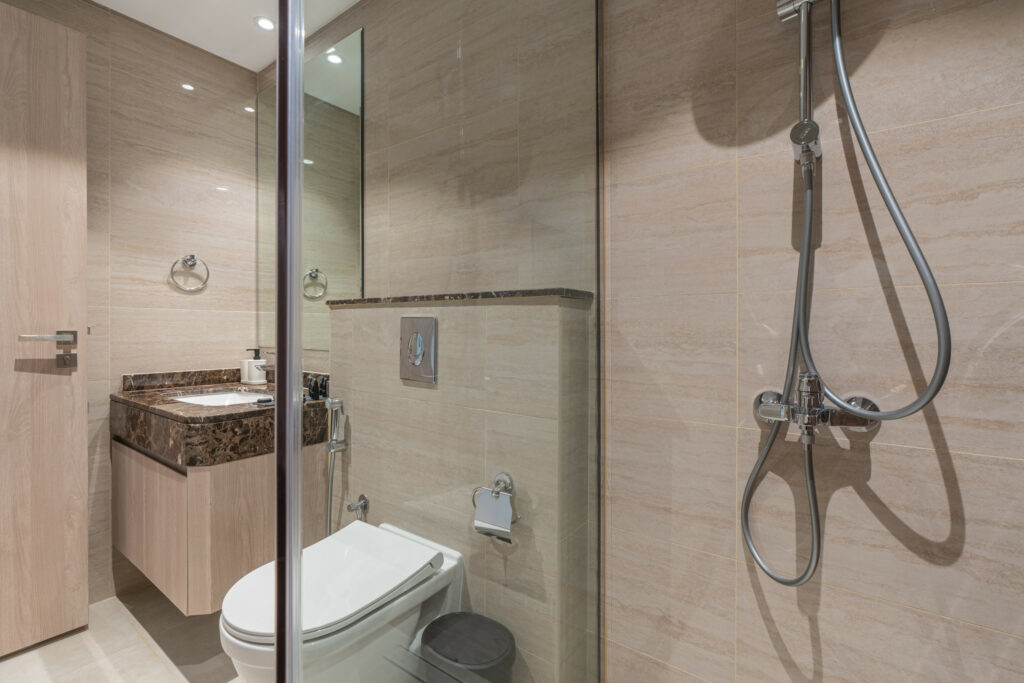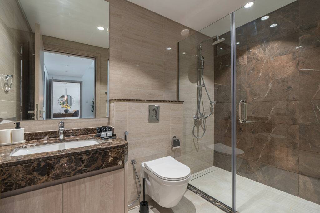 • Modern bathroom with walk-in shower
