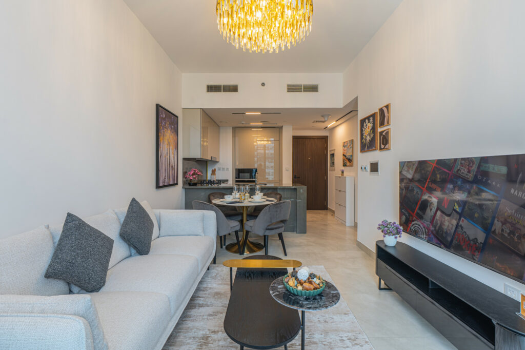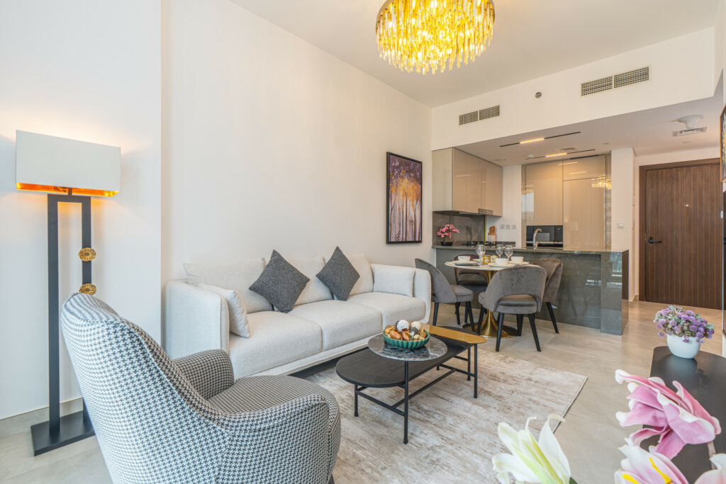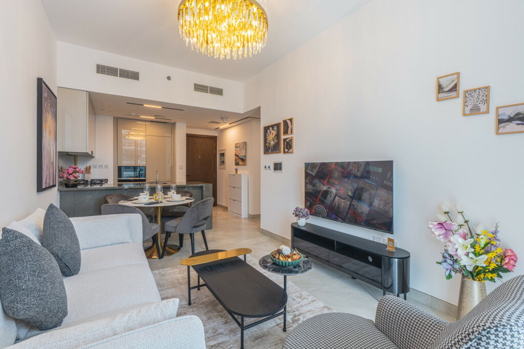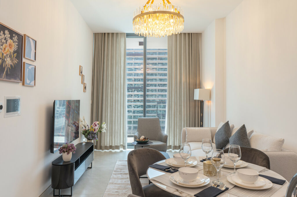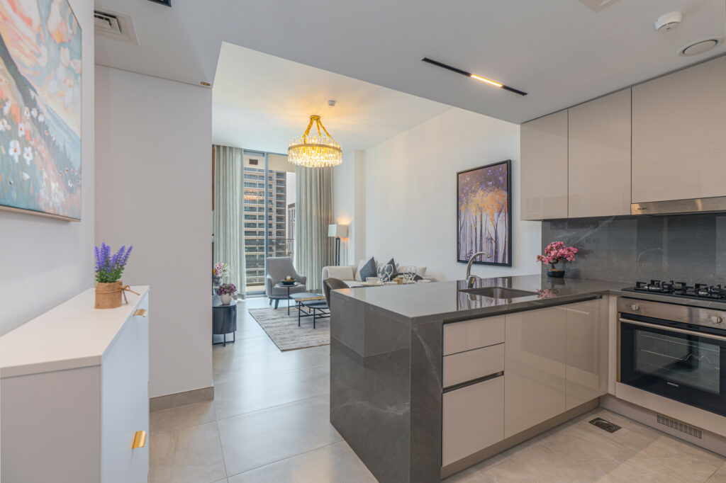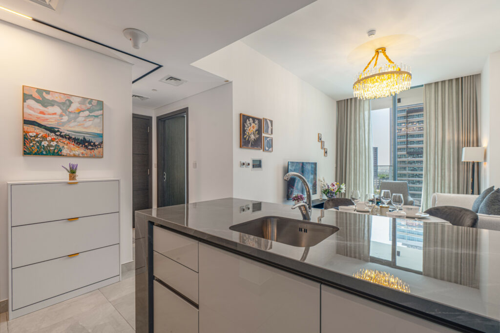 The apartment features a sleek open-plan layout with floor-to-ceiling windows that flood the space with natural light, highlighting its vibrant design. It is perfectly positioned near Downtown Dubai and the iconic Burj Khalifa, this home is ideal for travellers who want both comfort and convenience.