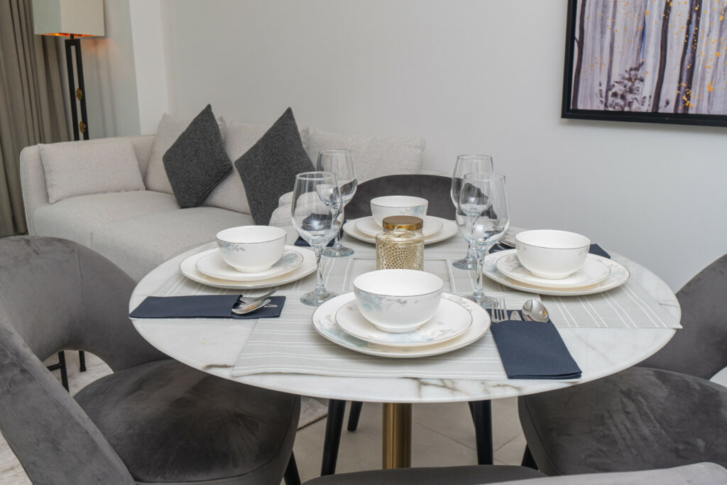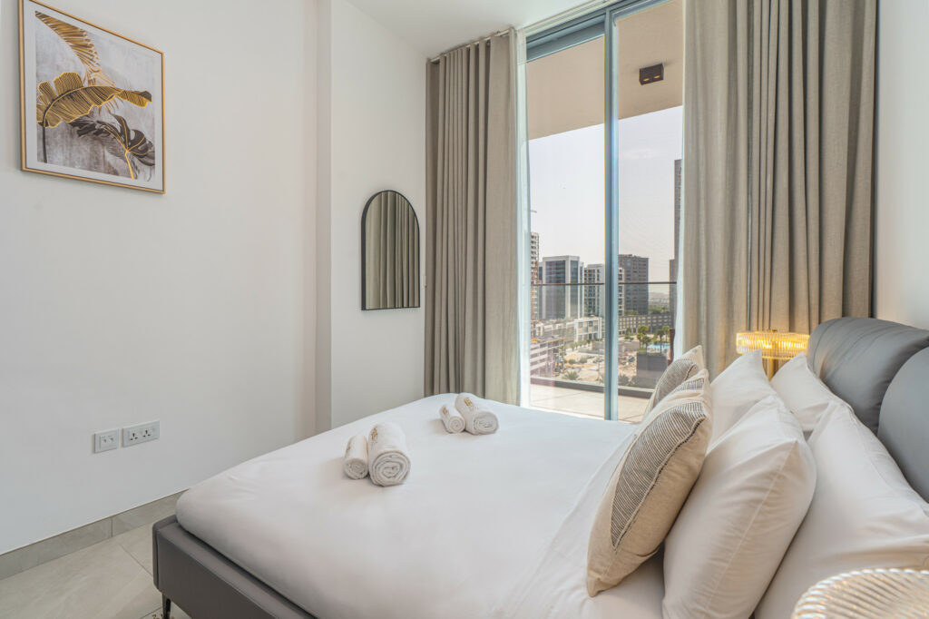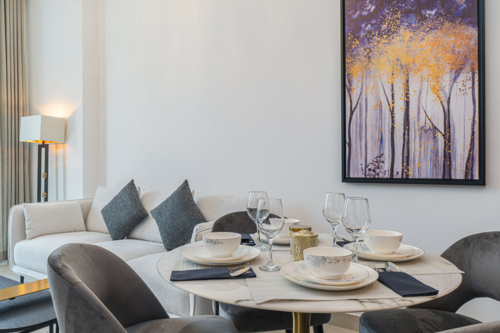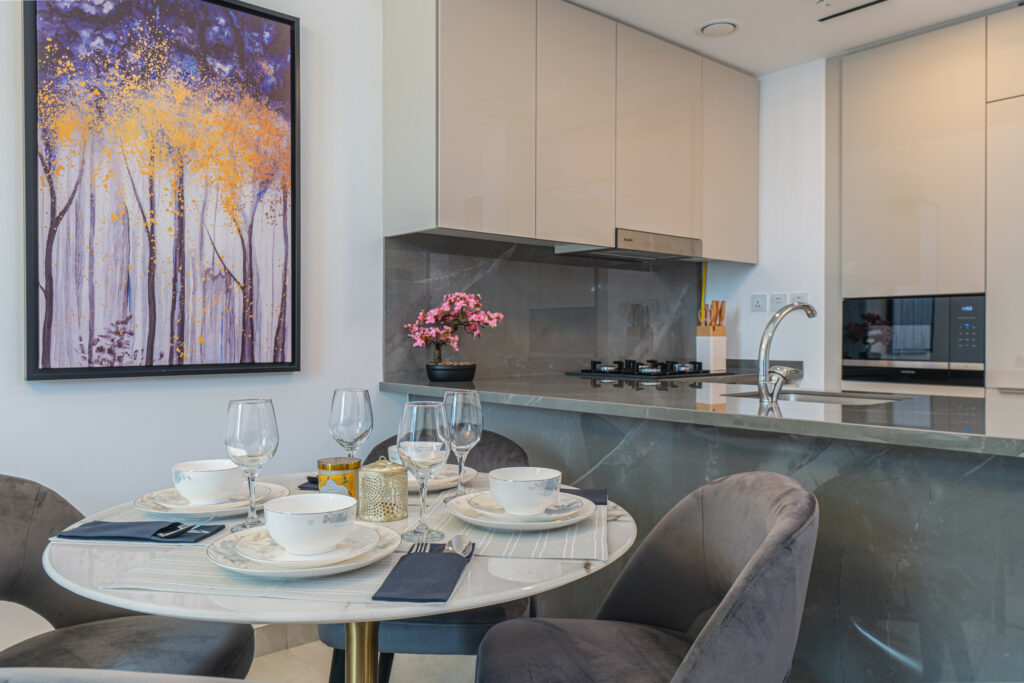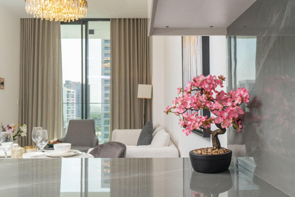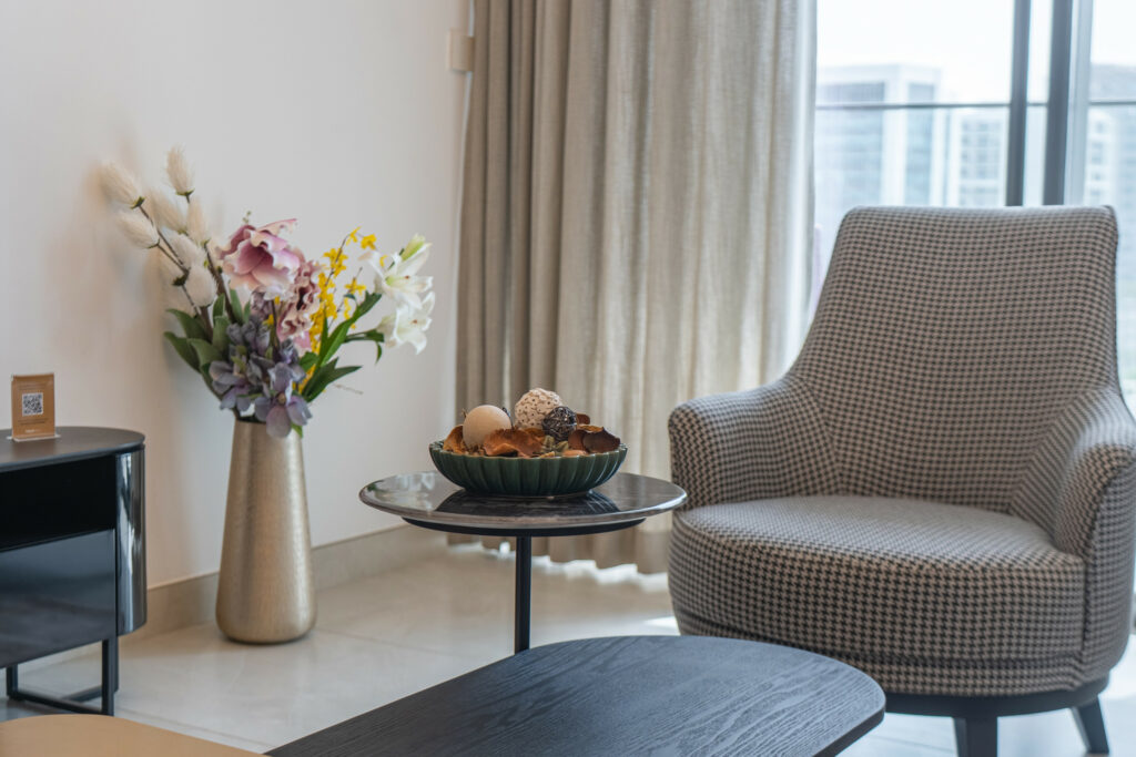 The apartment features a sleek open-plan layout with floor-to-ceiling windows that flood the space with natural light, highlighting its vibrant design. It is perfectly positioned near Downtown Dubai and the iconic Burj Khalifa, this home is ideal for travellers who want both comfort and convenience.