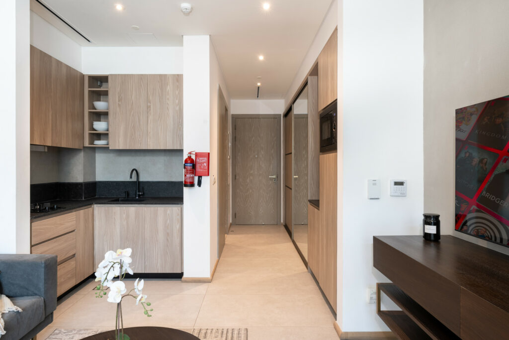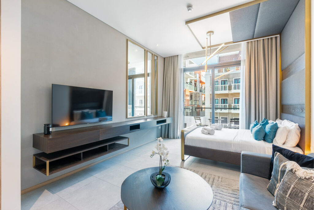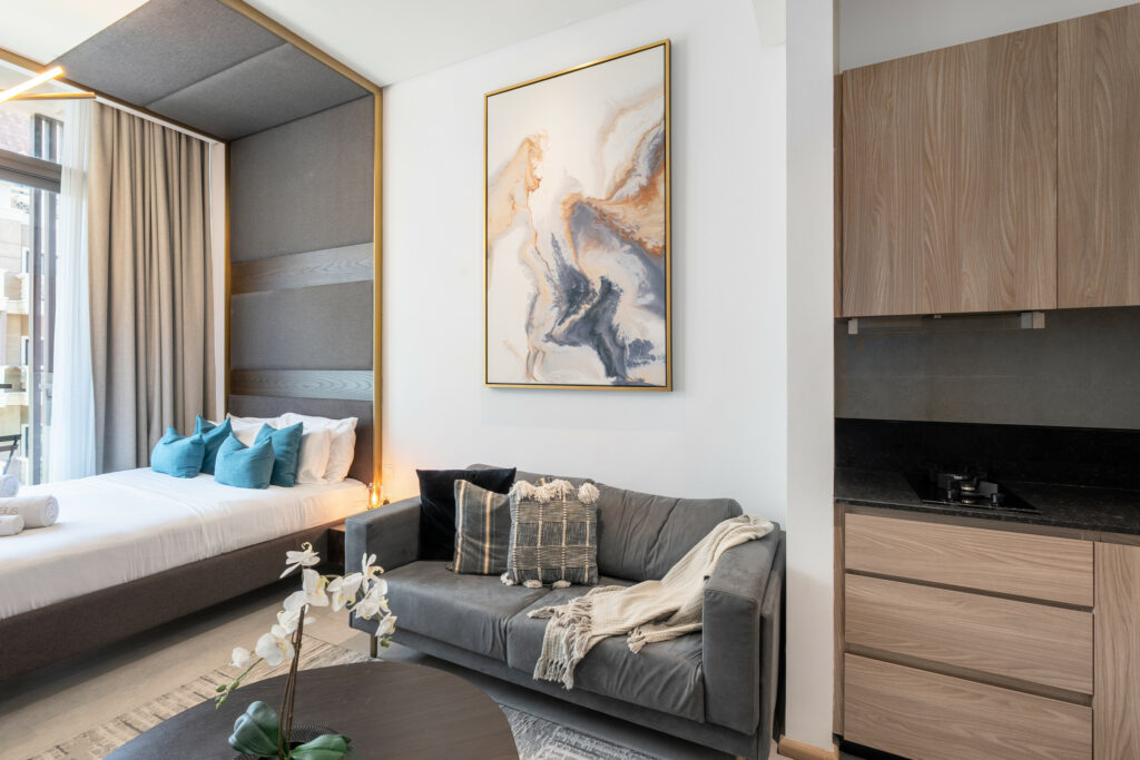 haus & haus holiday is delighted to bring you this exquisite Studio in Signature Livings, Jumeirah Village Circle. This first solar powered apartment building in JVC redefines green living with a vision of sustainability that both respects nature and promotes well-being. Experience hotel-style living with its ultra sleek interior finishes, resort style courtyard pool, beautiful landscapes, and modern facilities.