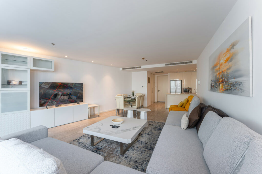 • Bright and spacious living area with comfortable seating and smart TV