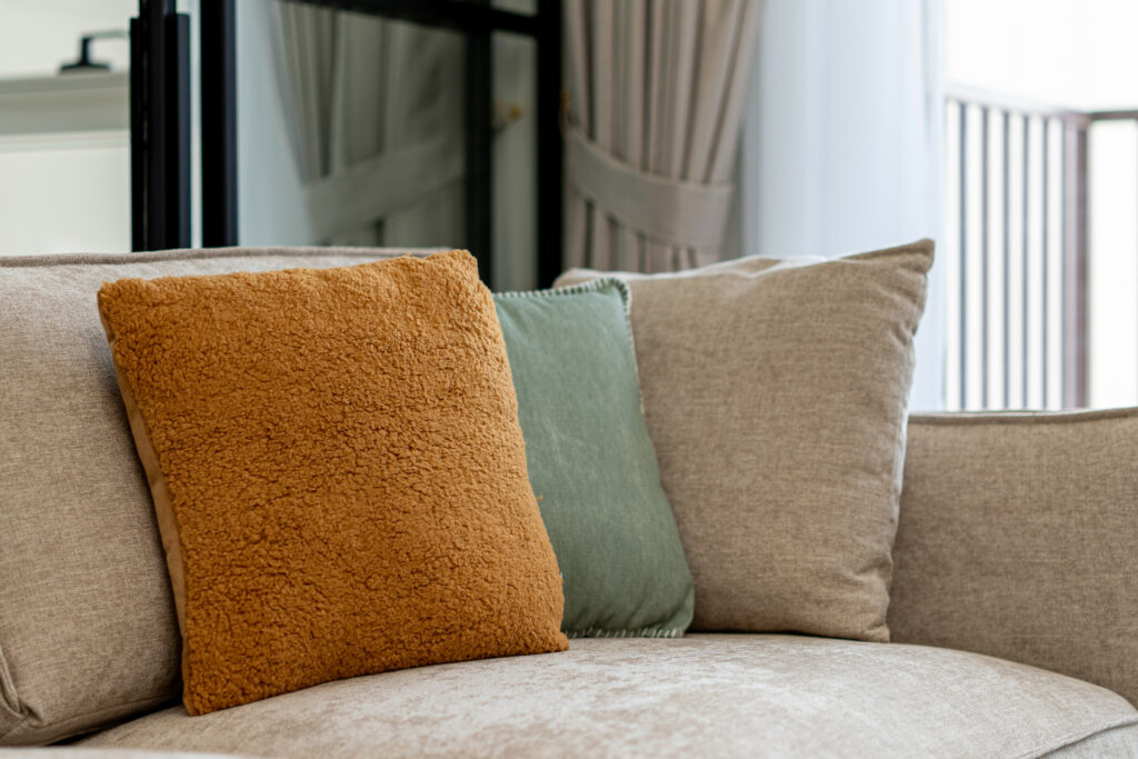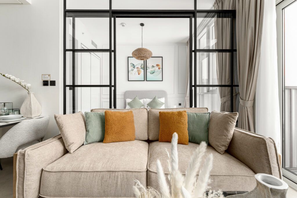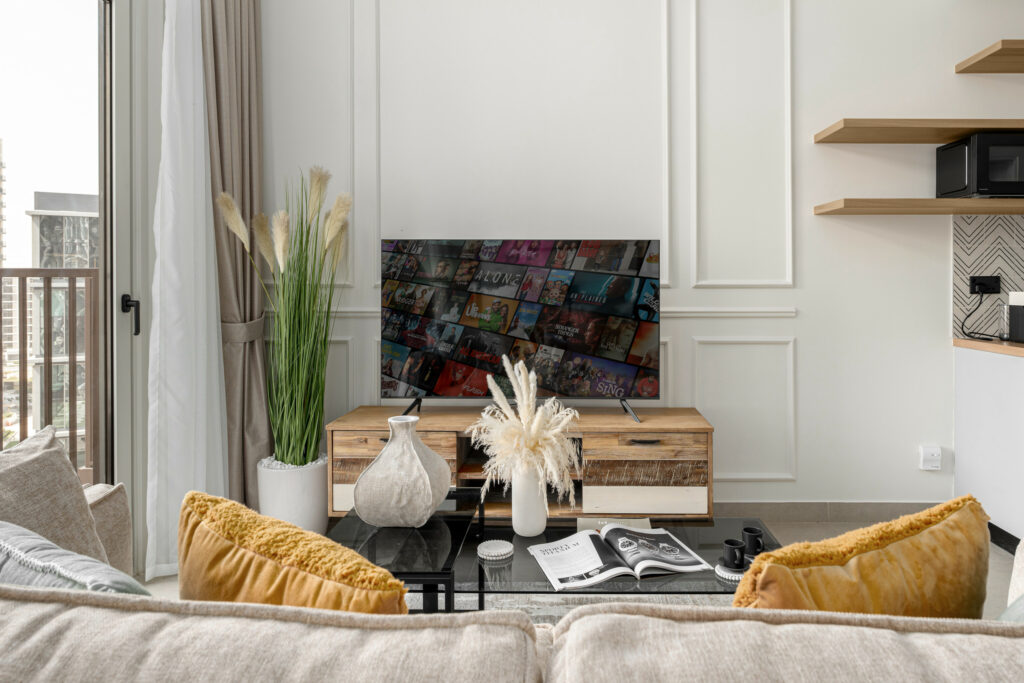 • Stylish living area in warm tone accents with comfortable sofa and a smart TV