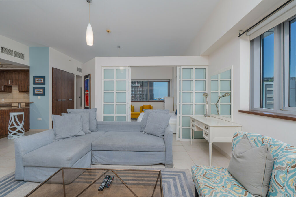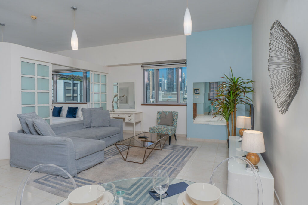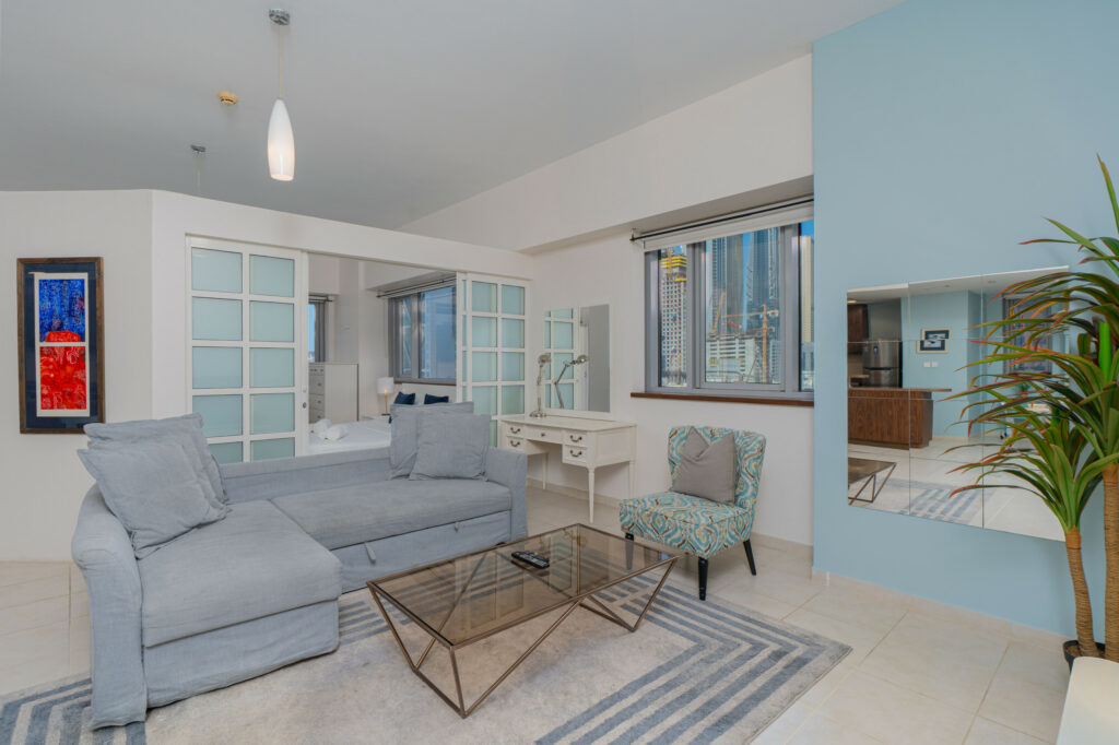 haus & haus holiday is pleased to present this exceptionally spacious Studio Apartment in Executive Tower, Business Bay, thoughtfully designed with a clear partition separating the bedroom and living area for added comfort and privacy.