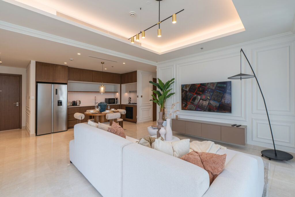 • Elegant living space with smart TV and comfortable sofa bed