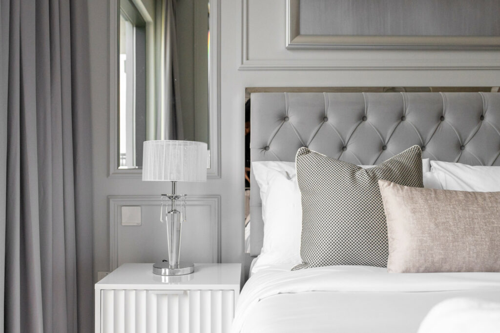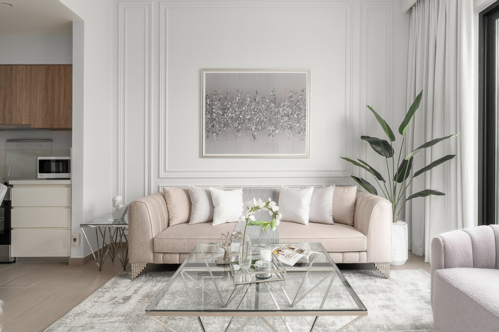 • Deluxe and well-lit living space in warm and silver accent tones, a plush sofa and a smart TV