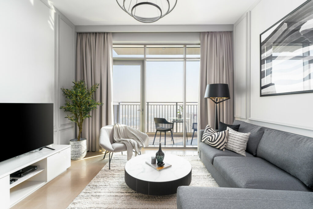 • Tranquil and bright living area with cosy L-shaped sofa, marble top coffee table, and smart TV