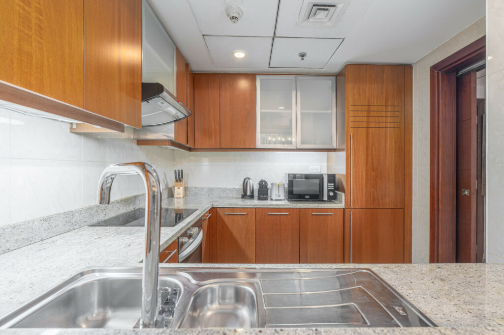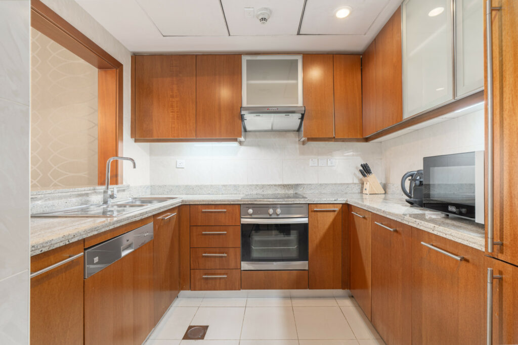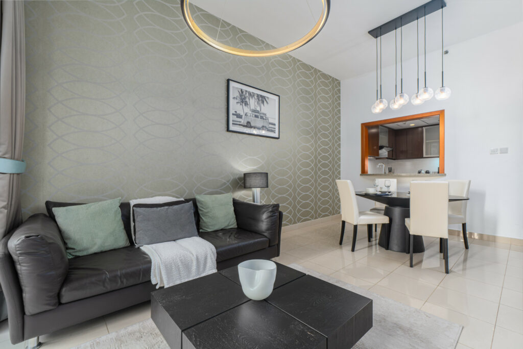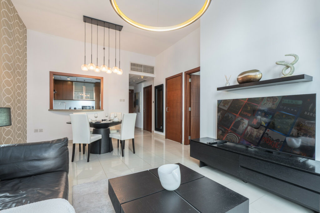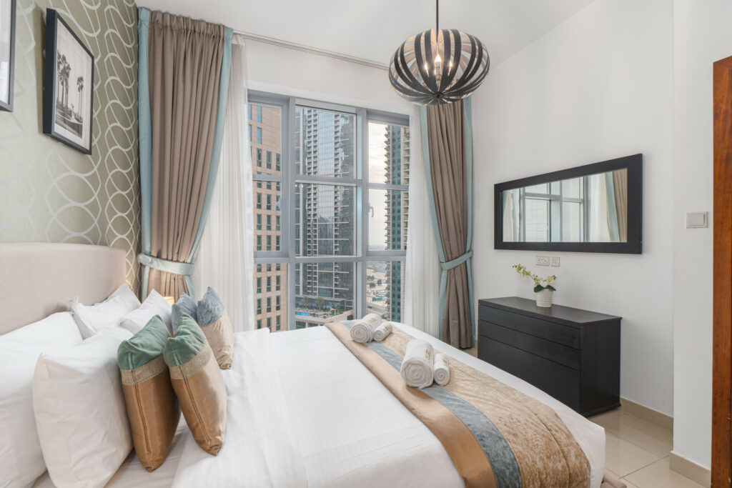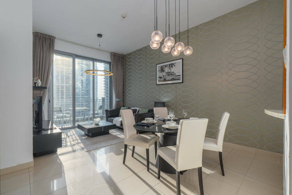 Set on a high floor, this charming home features pool views and a lovely partial glimpse of the Dubai Fountain, giving guests a true taste of the city’s iconic skyline. With its warm interiors, modern furnishings, and unbeatable location just moments from Dubai Opera, Burj Khalifa, and Dubai Mall, this residence is ideal for travellers seeking comfort and prime city access.