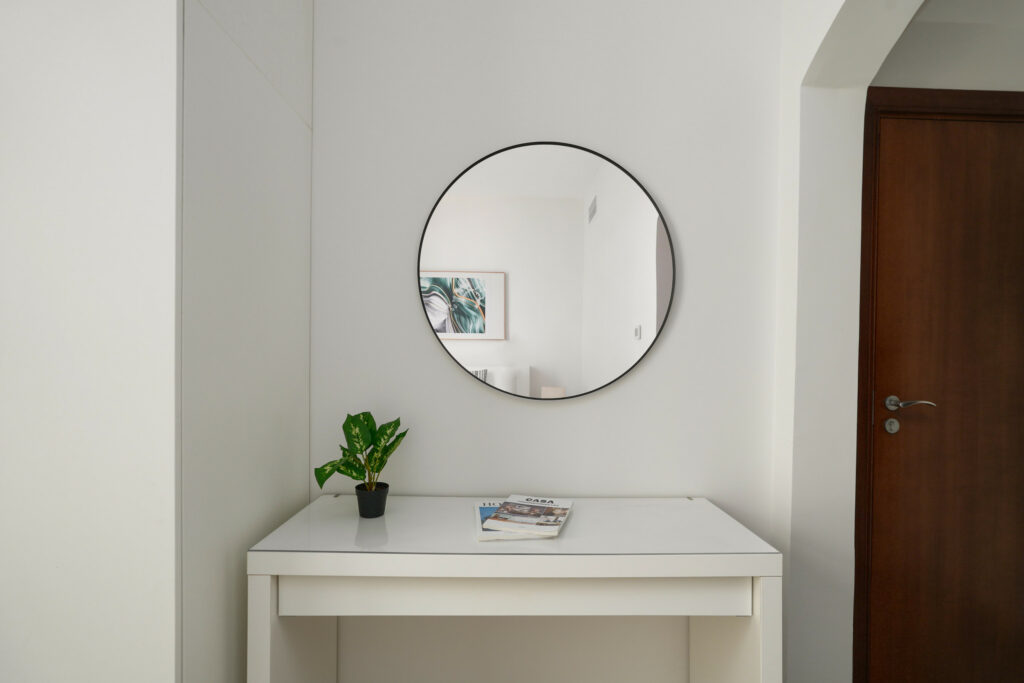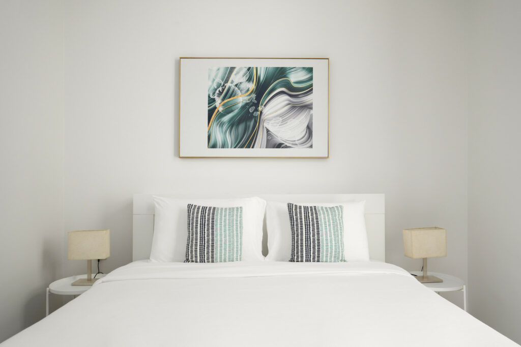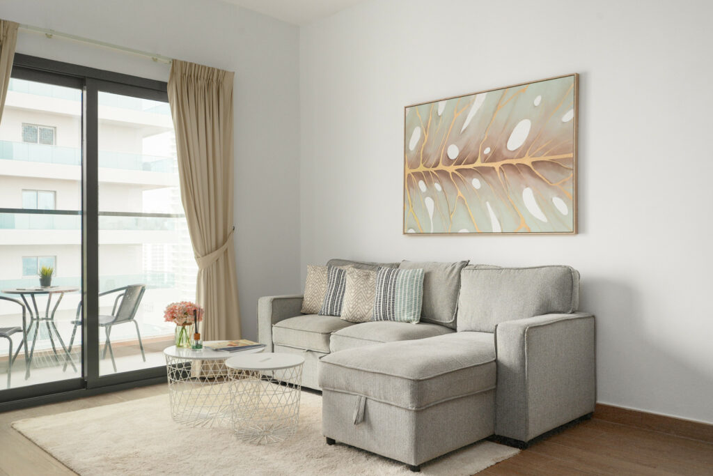 The apartment boasts modern furnishings and wide windows that showcase the beauty of the neighbourhood.