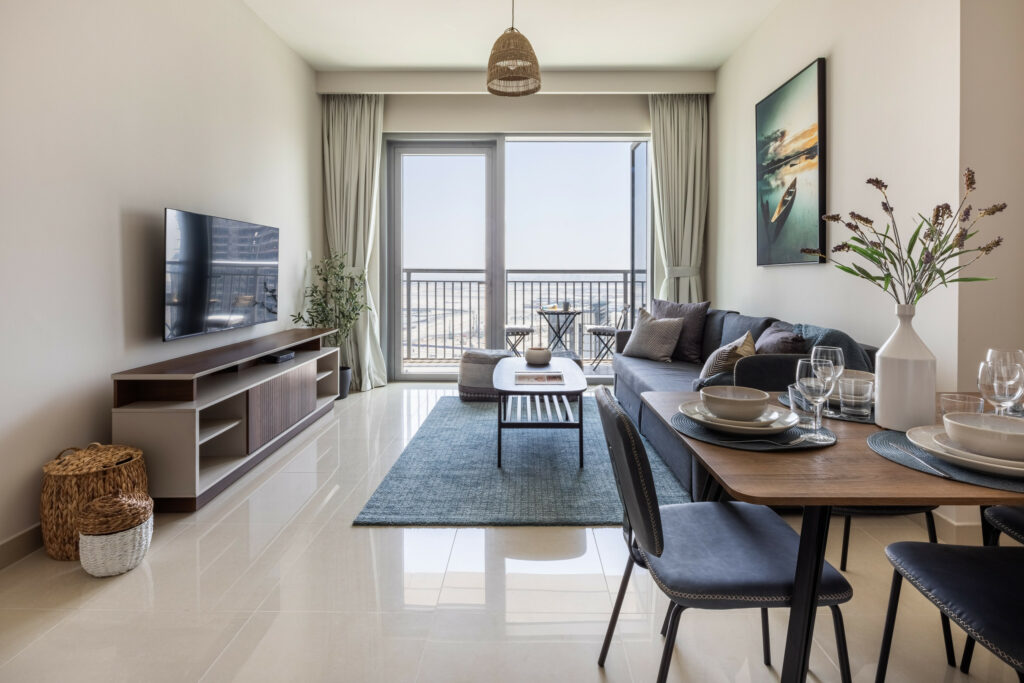 • Bright living space with comfortable sofa and smart TV
