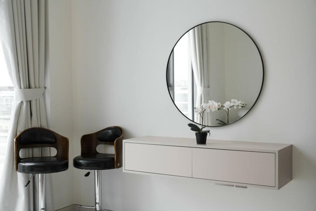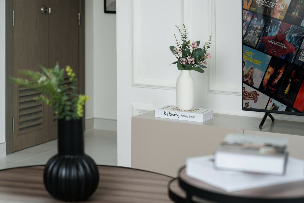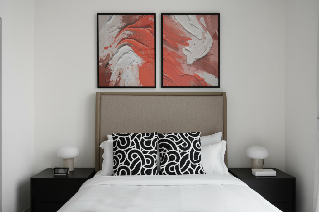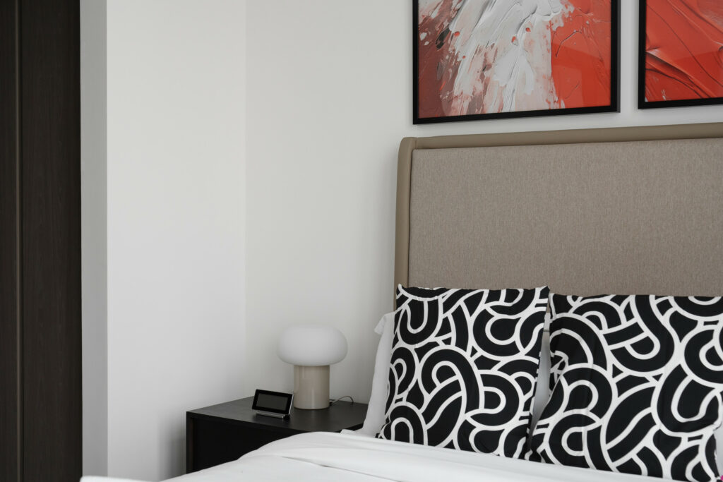 This chic holiday residence offers a breathtaking view of the serene lagoon and the iconic Burj Khalifa skyline from its balcony. This picturesque backdrop provides the perfect sanctuary for unwinding and rejuvenating after a busy day.