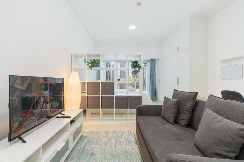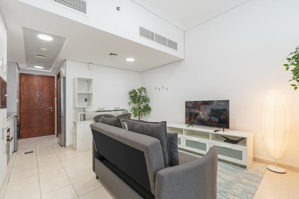 • Bright living area with sofa bed and smart TV