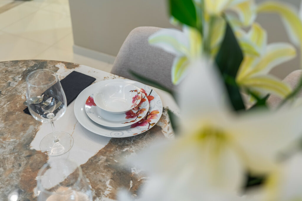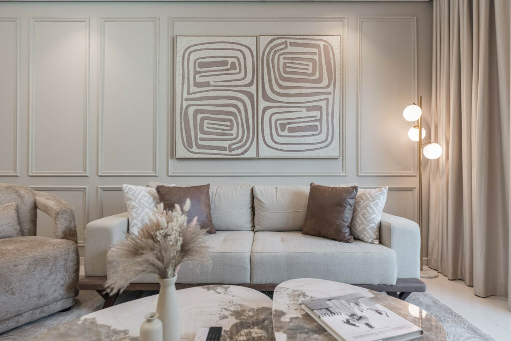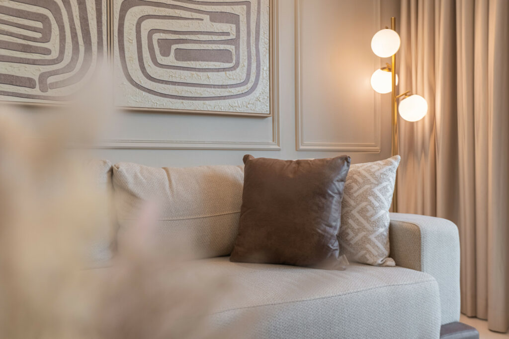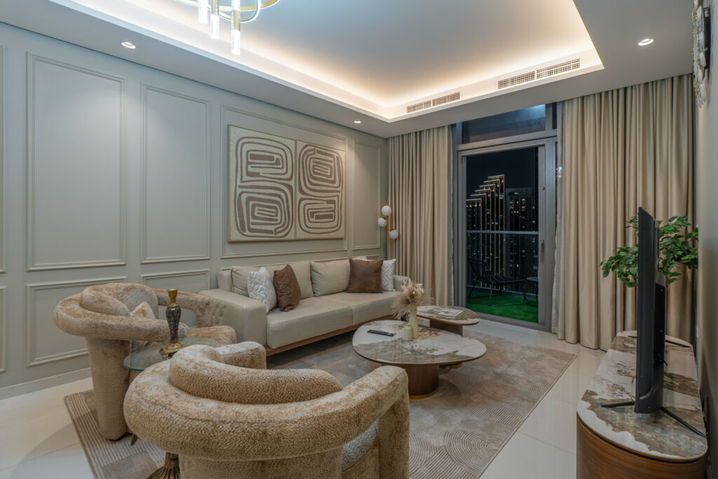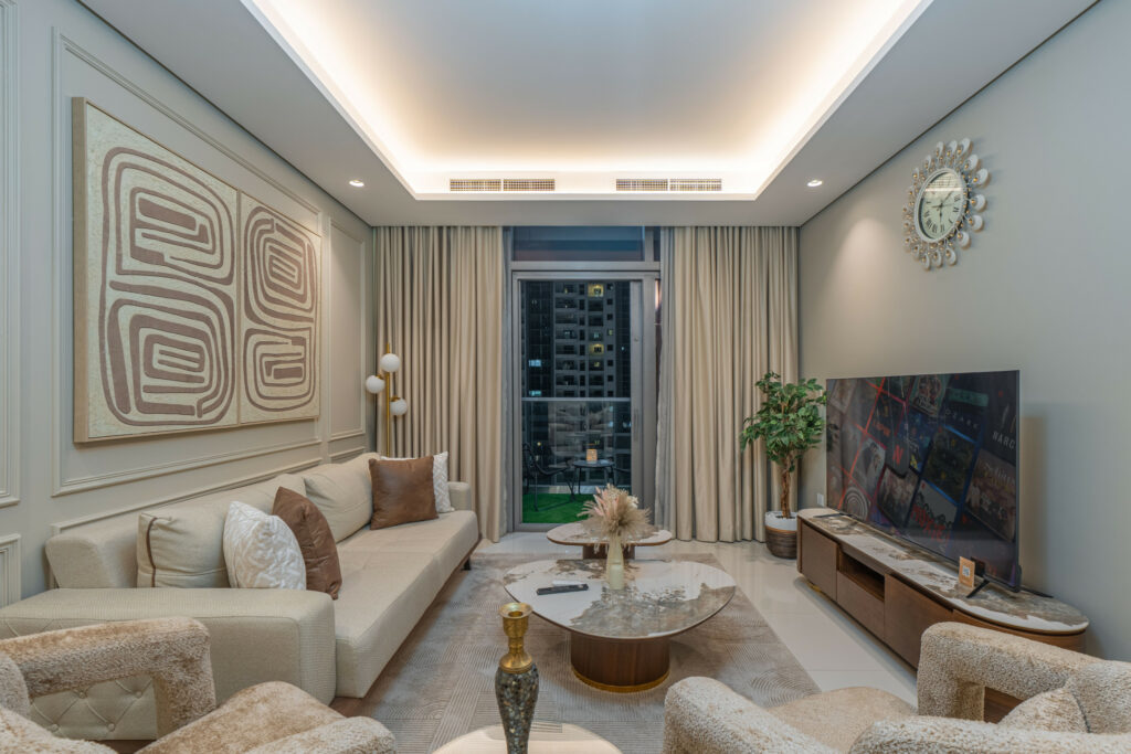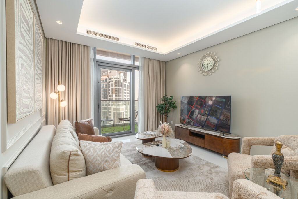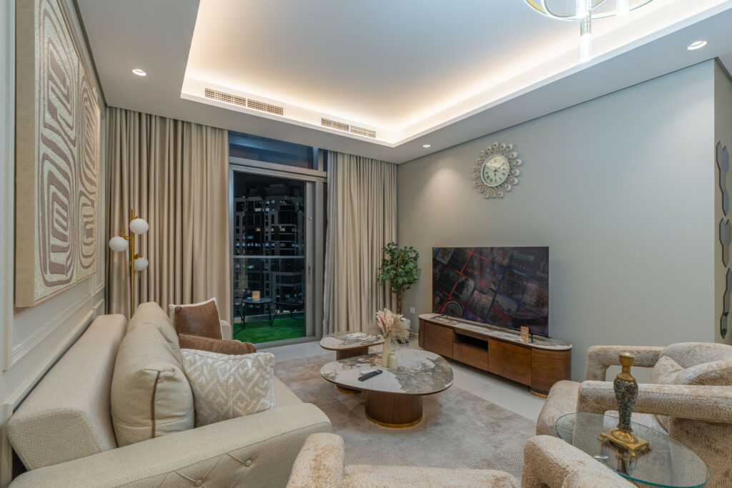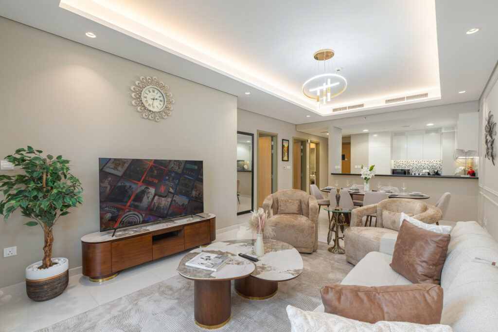 • Meticulously furnished living space with elegant furniture and smart TV