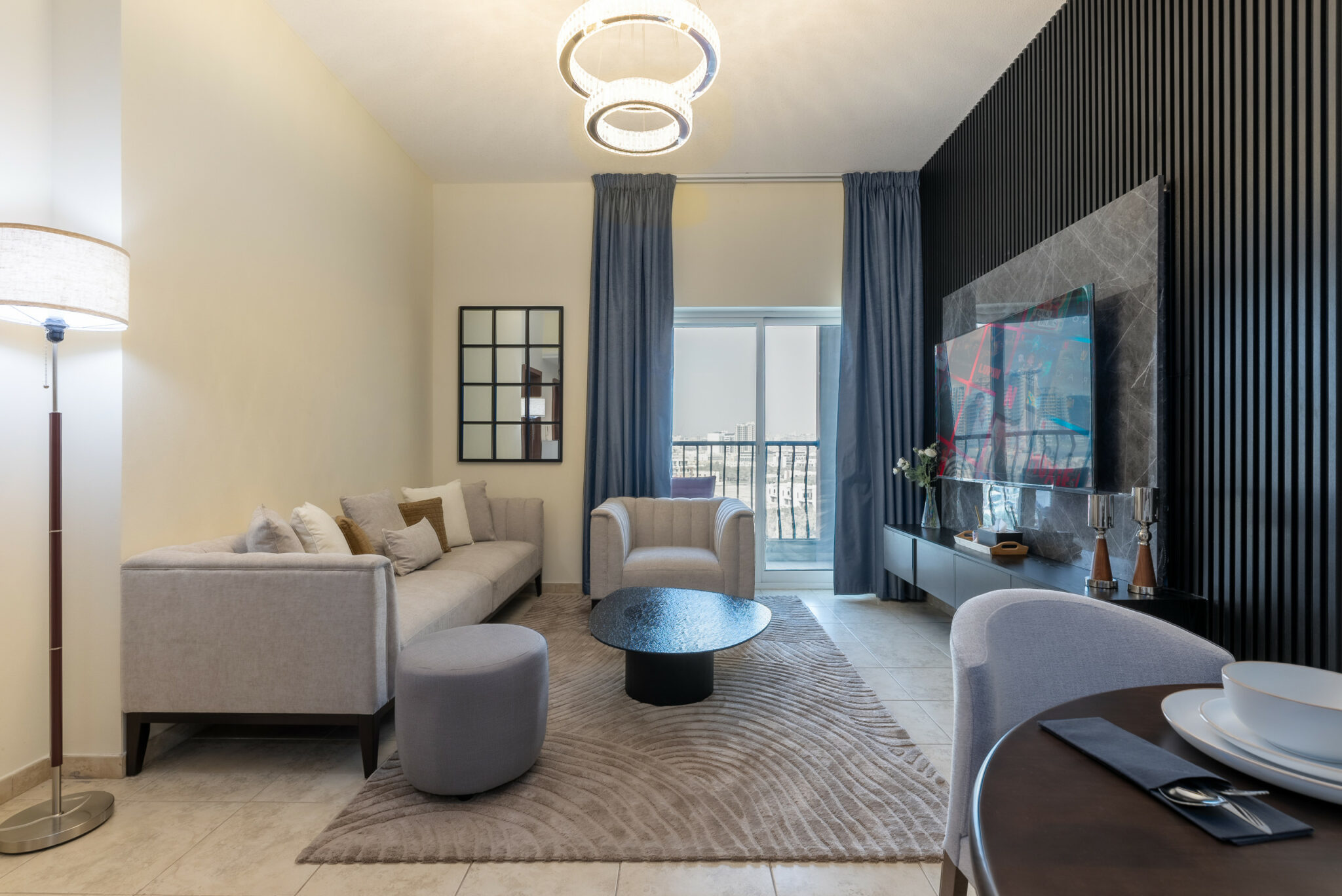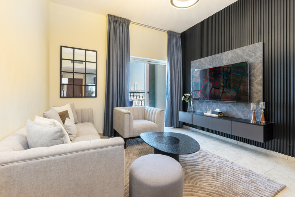 • Living space with comfortable seating and smart TV