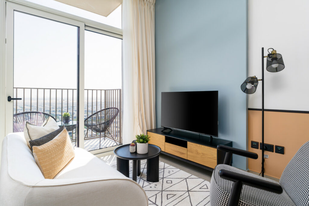• Serene living area in chic blue and white accent tones with comfortable sofa and a smart TV