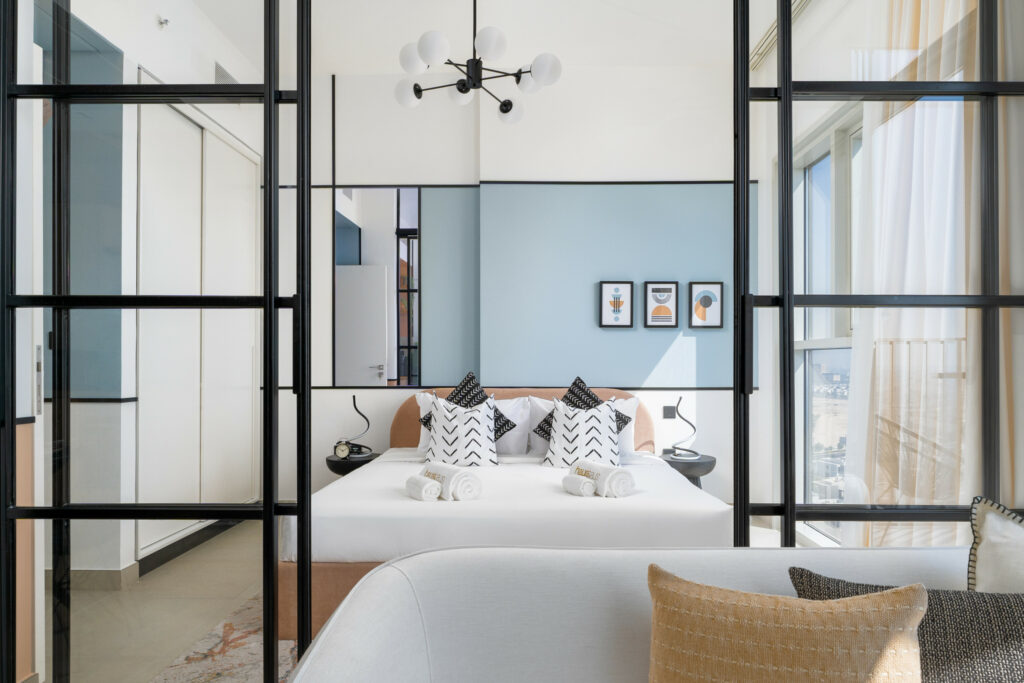 • Beautiful bedroom with a unique glass wall across the living area