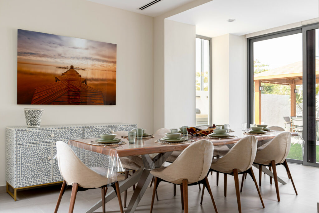 • Solid wood dining table that comfortably seats 8 persons, access to garden area