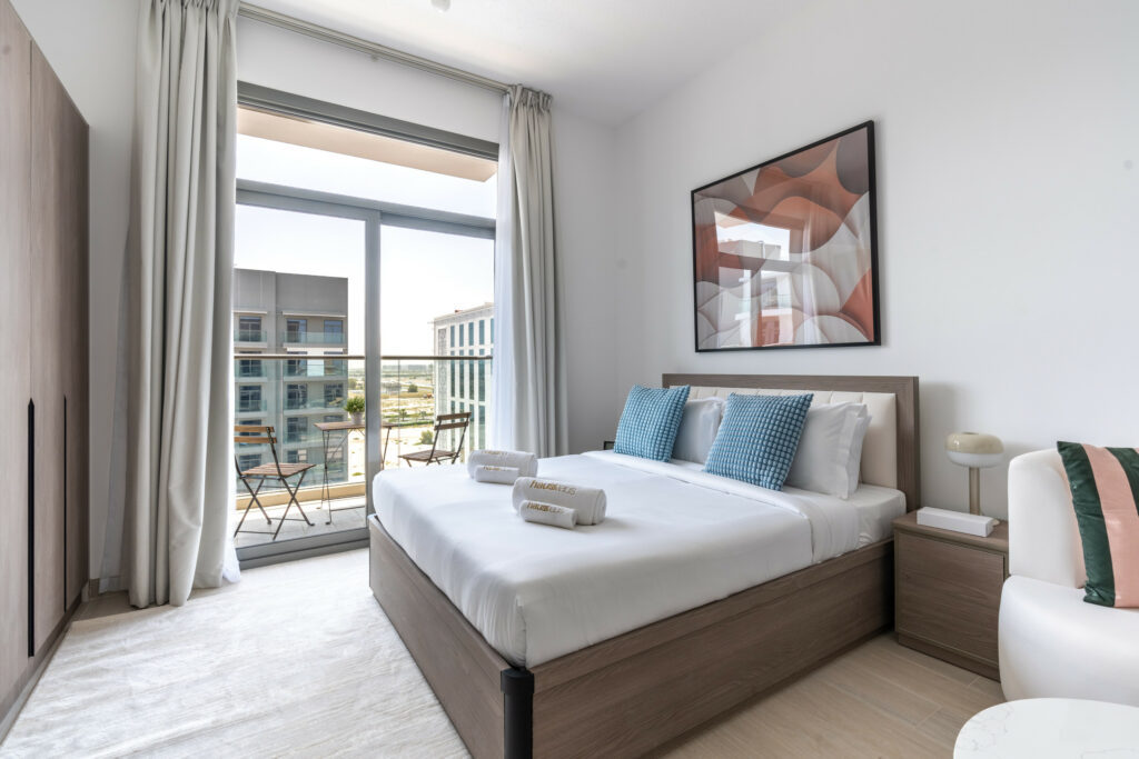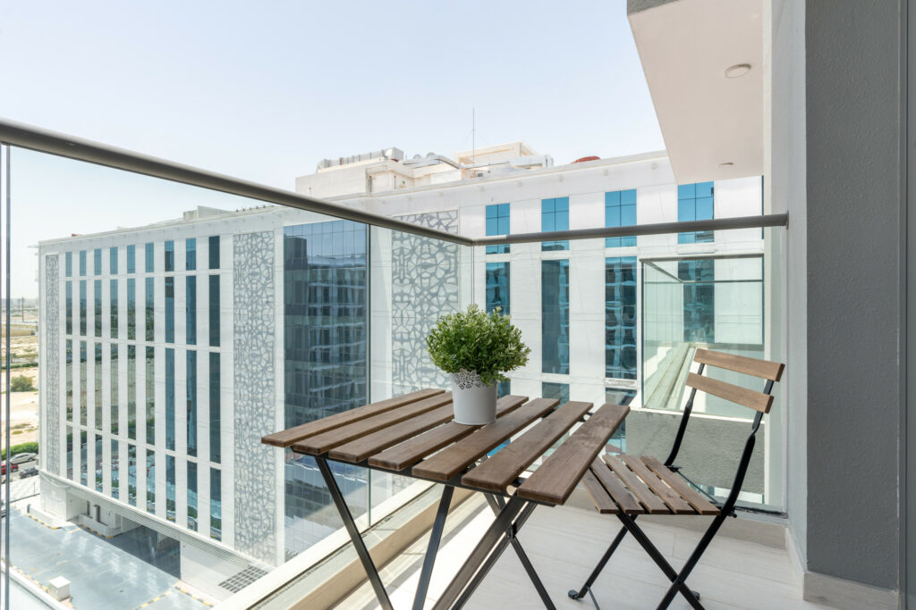 Welcome to your thoughtfully designed studio featuring a comfortable living space with contemporary furnishings, a fully equipped kitchen with quality appliances, and a cozy balcony area showcasing the alluring view of the amenity area.