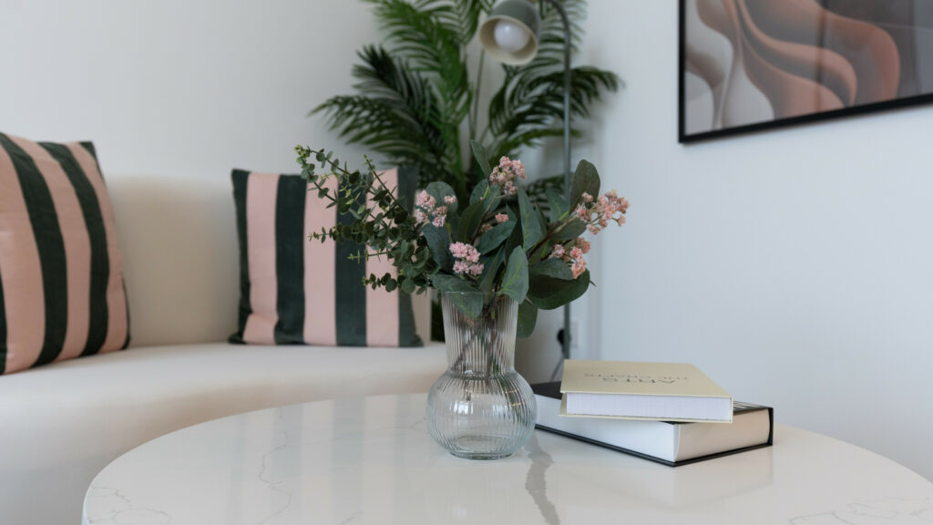 • Stylish living area featuring a comfortable sofa and smart TV