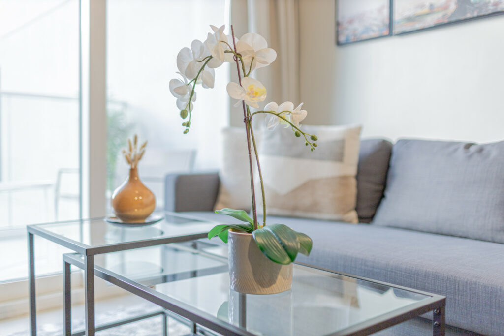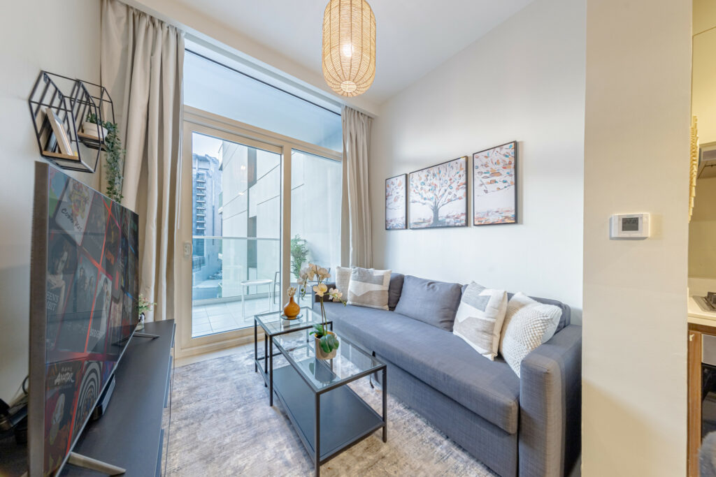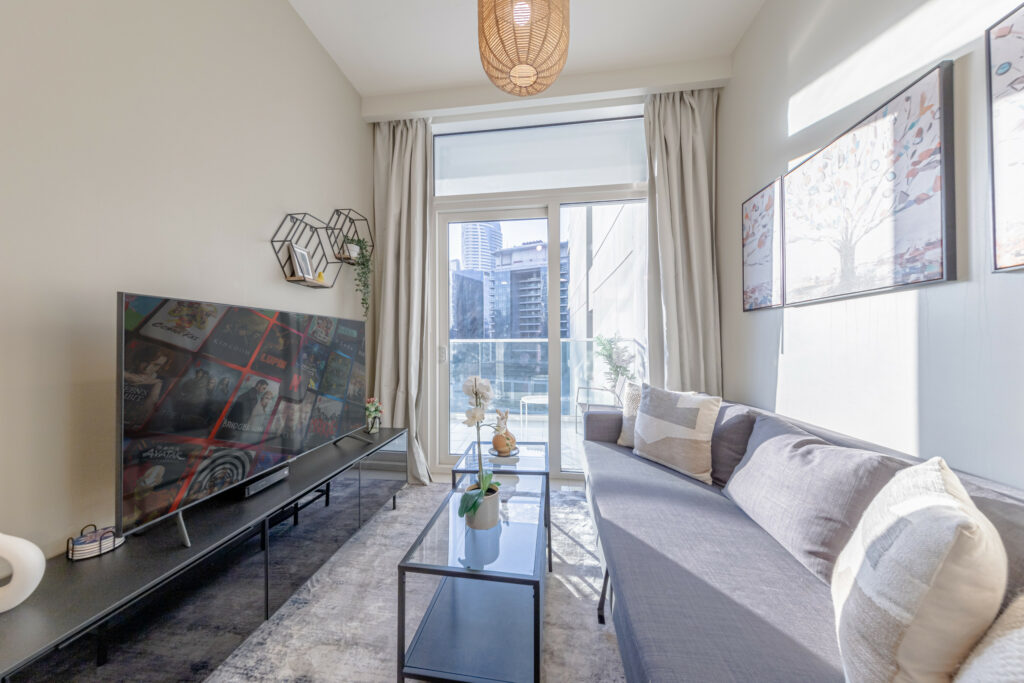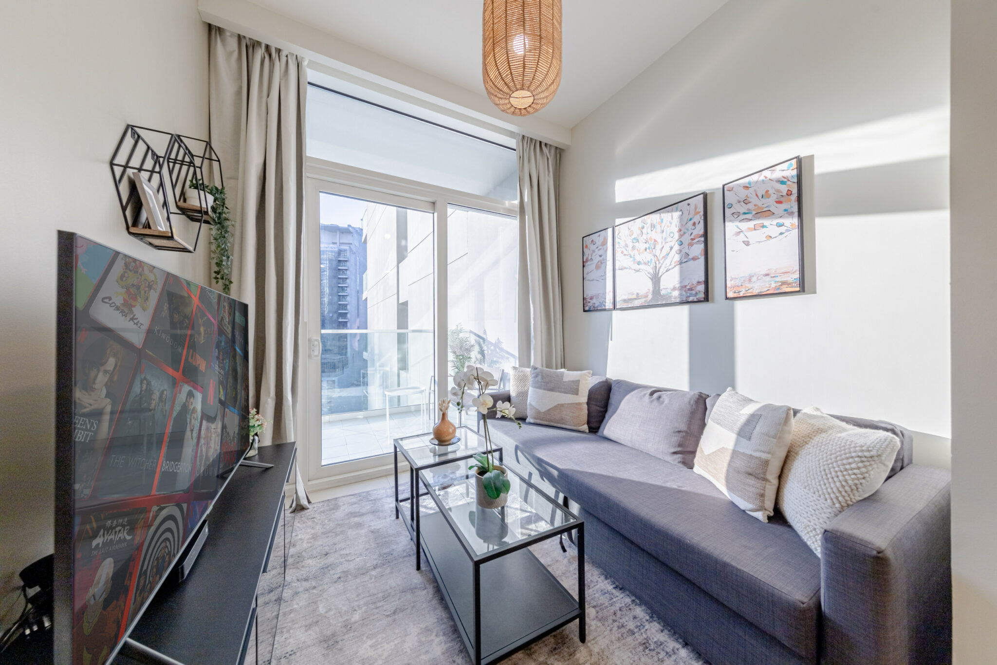 • Bright living space with comfortable sofa and smart TV