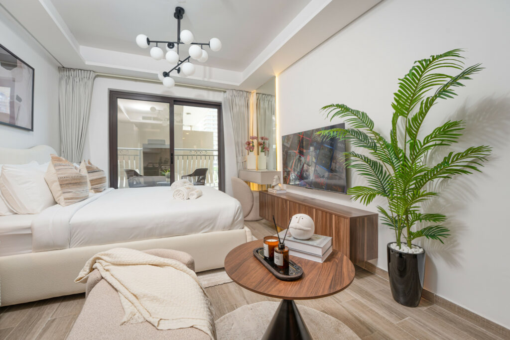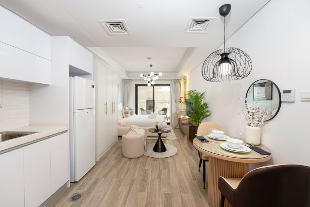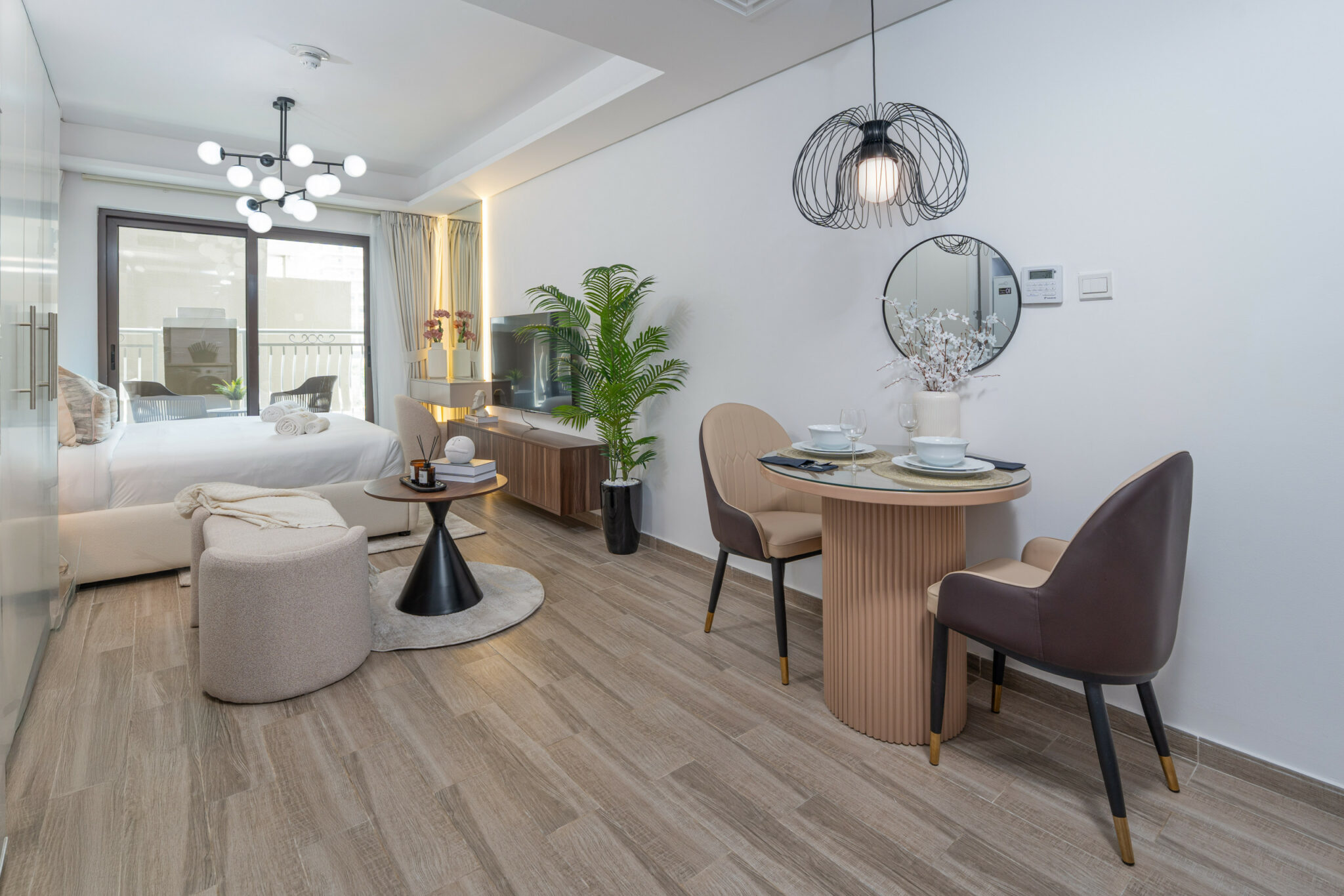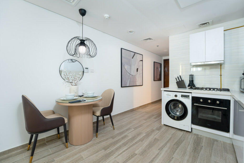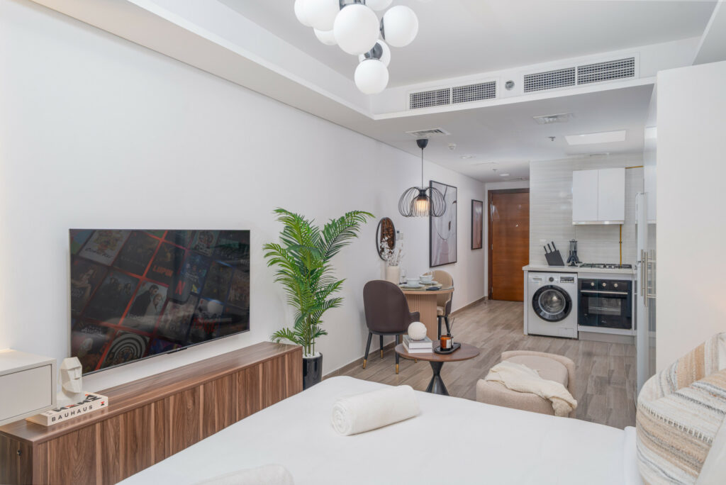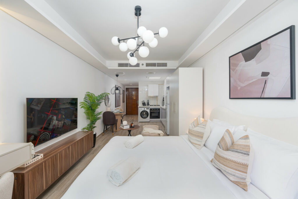 haus & haus holiday is pleased to present this beautifully furnished Studio Apartment in Laya Mansion, Jumeirah Village Circle. Designed with a modern and chic aesthetic, this cosy space is ideal for a relaxed and comfortable stay. Set in the fast-growing JVC community, guests can enjoy access to nearby parks, shops, cafes, schools, clinics, and Circle Mall—making it a well-rounded neighbourhood for short or extended visits.
