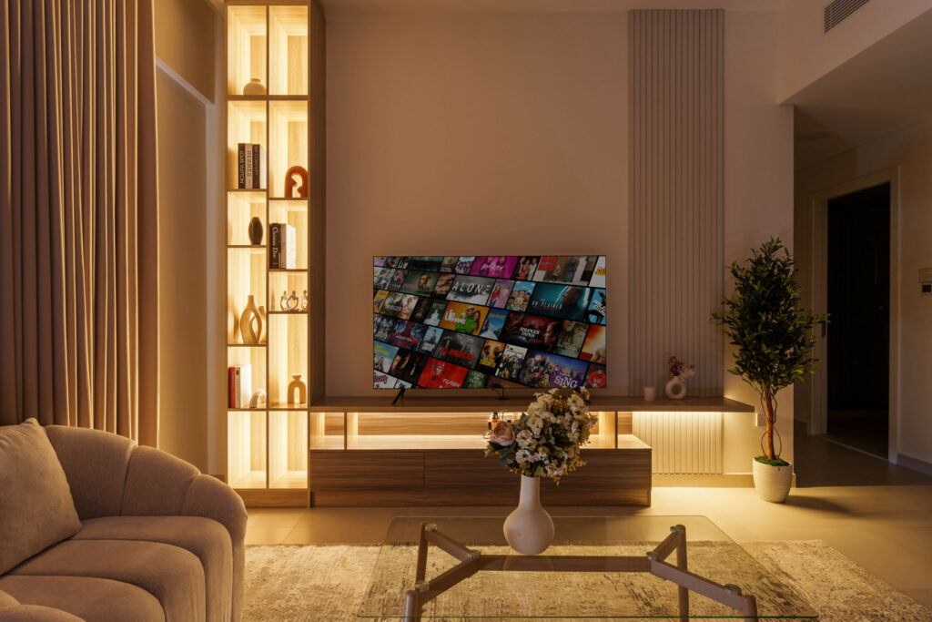 • Bright, cosy living area with plush seating and a 65" Samsung smart TV