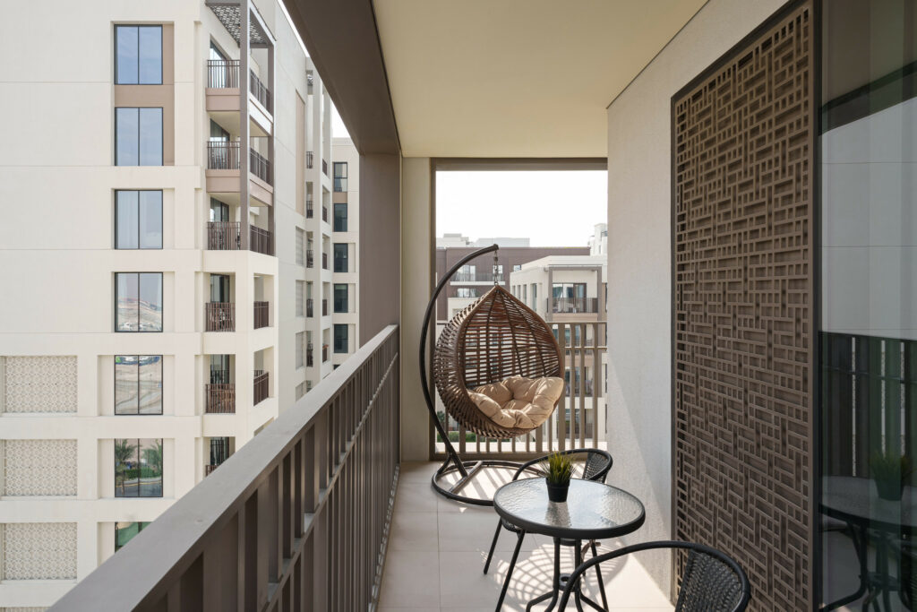 • Community and skyline views from a furnished balcony featuring a cozy hanging egg chair
