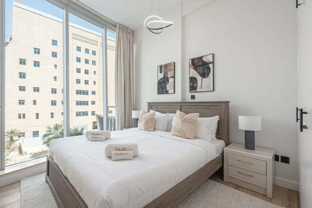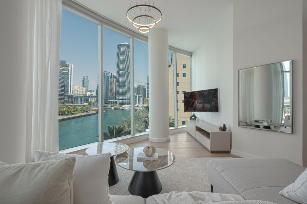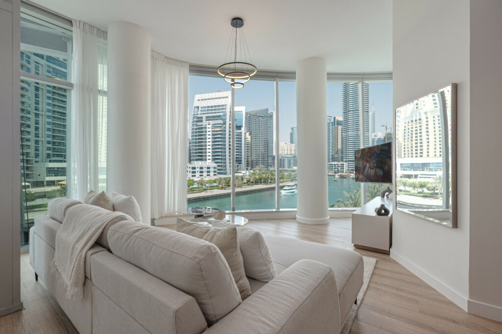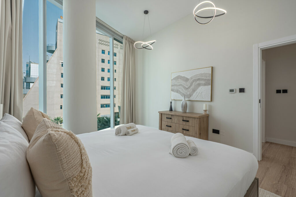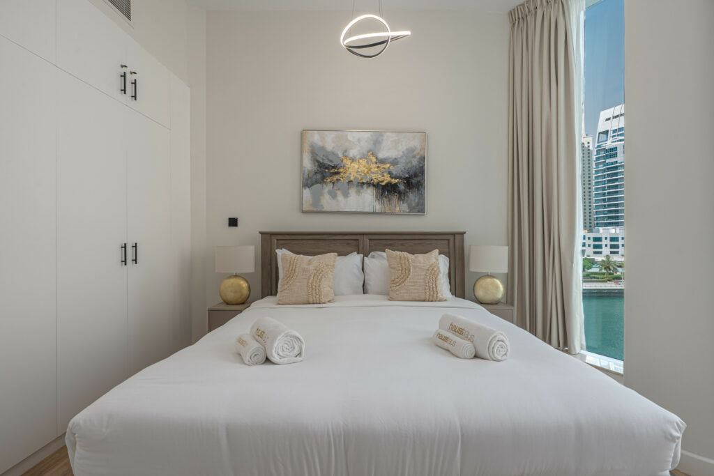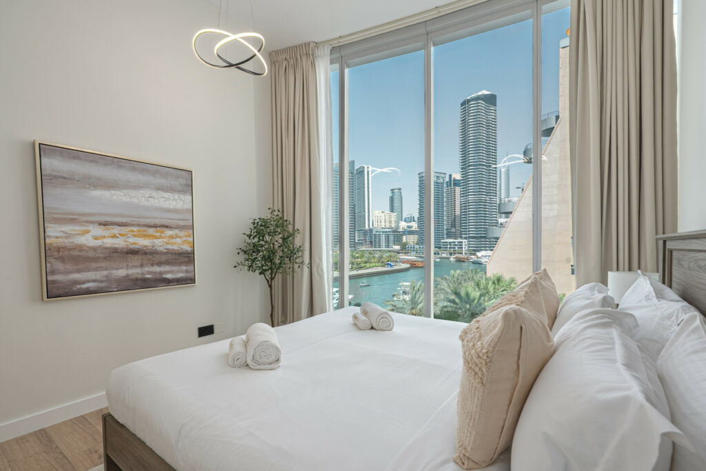 Additionally, it has a large floor-to-ceiling windows, a sleek décor, and a private balcony that make it ideal for relaxing and taking in the stunning views of the yacht-dotted marina.