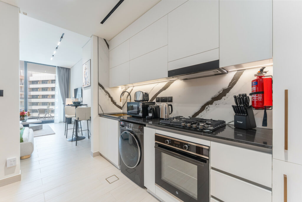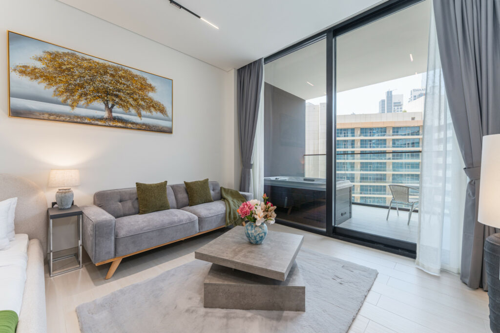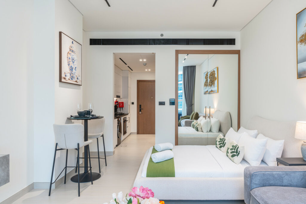 haus & haus holiday proudly presents this stylish studio apartment in Binghatti Trillionaire, Business Bay – where comfort meets contemporary living in the heart of Dubai.