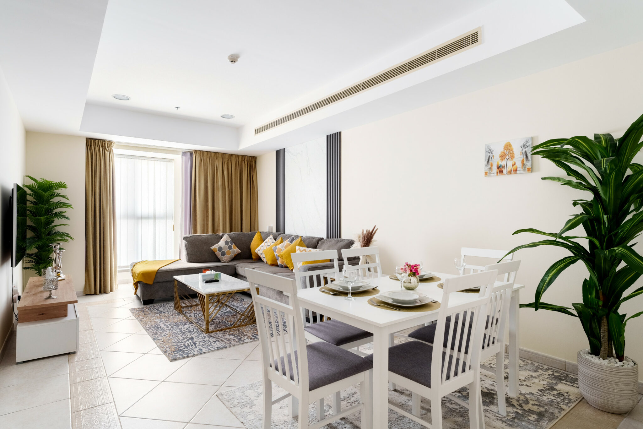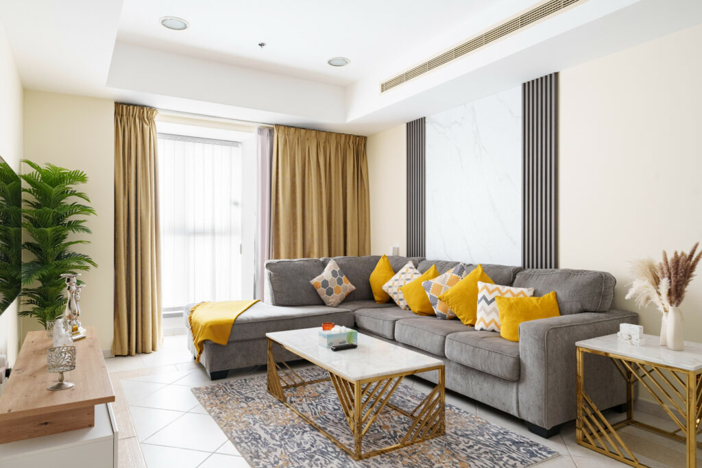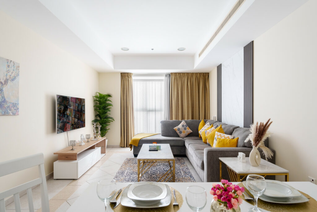 • Tranquil and well-lit living space with comfortable sofa and smart TV