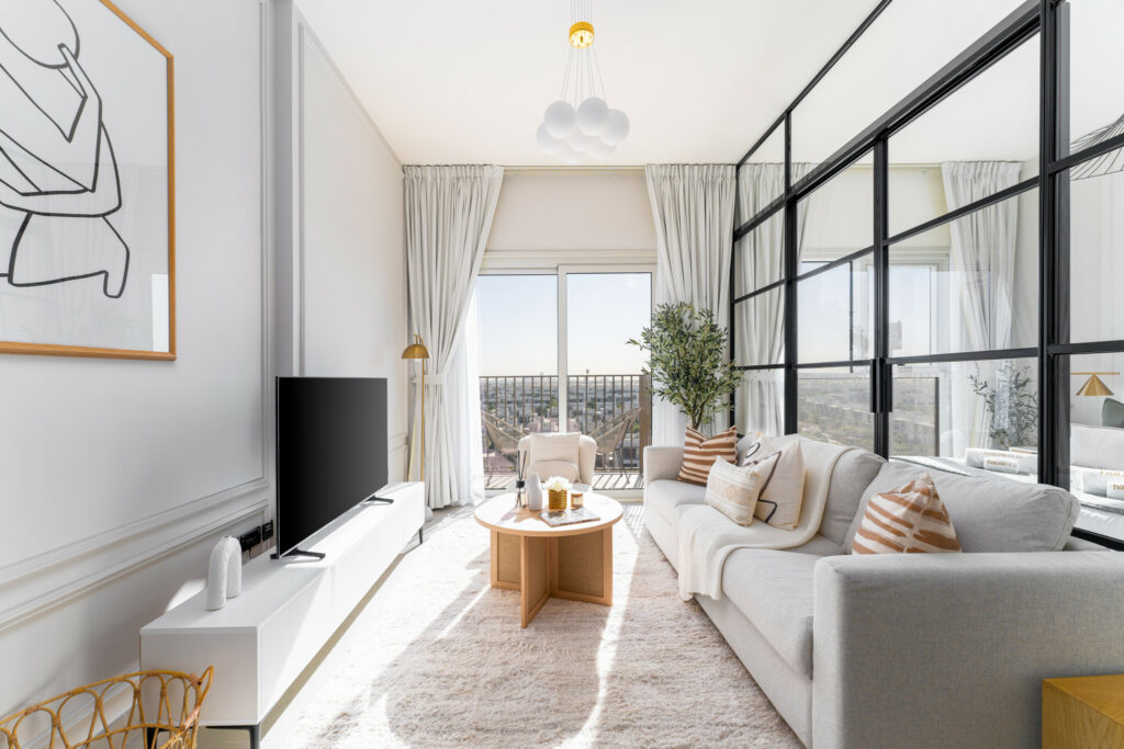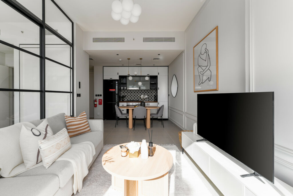 • Stylish living area in calm & relaxed accent tones with comfortable sofa and a smart TV